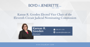 Kansas R. Gooden was recently elected Vice Chair of the Eleventh Circuit Judicial Nominating Commission. The commission reviews and vets judicial applicants to the Miami-Dade County Court and Eleventh Circuit Judicial Court. Ms. Gooden was first appointed to the commission by Governor DeSantis in 2022. Kansas R. Gooden Shareholder / Practice Group Leader Direct: 305.537.1238 Email: kgooden@boydjen.com About Kansas R. Gooden Kansas R. Gooden, a Board Certified Appellate Specialist and AV Rated attorney, serves as the firm’s General Counsel and Appellate Practice Group Leader. Ms. Gooden currently works remotely for the firm […]
